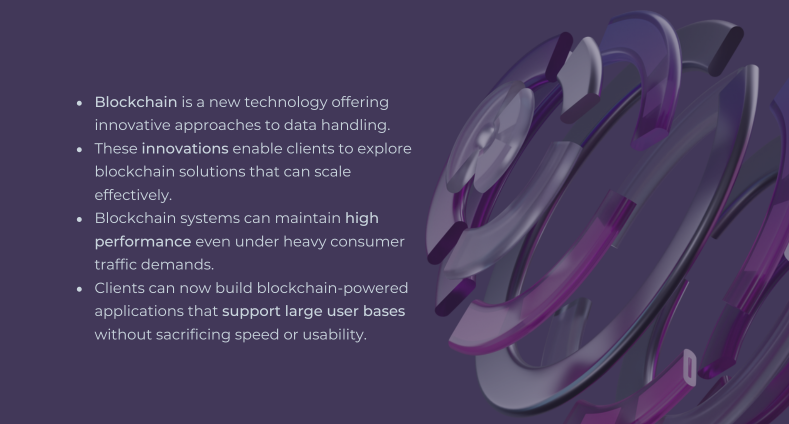Blockchain is a new technology and innovations in data handling are allowing clients to explore blockchain solutions that have the capacity to scale and reach the highest performance levels even when responding to heavy consumer traffic system demands. These innovations make it feasible for clients to build blockchain-powered applications that can power large user base infrastructure without sacrificing speed or usability.
